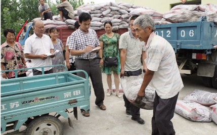 9日,黄潭镇复兴村村民在搬运有机肥料。复兴村在洪涝灾害中受灾严重,为支援群众灾后生产自救,市科技局驻复兴村工作组积极联系福临公司,送来60吨有机肥料。(本报记者邓慧遐摄)