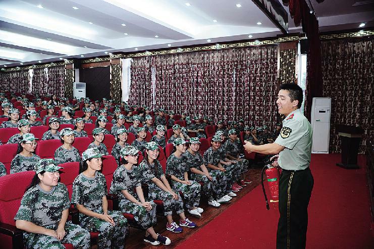 9日,在天门职业学院,市公安消防大队官兵教授学生如何使用灭火器,为学生送去“消防知识第一课”。连日来,该大队消防官兵深入全市各校开展“消防知识进军训”活动,进一步增强各校师生们的消防安全意识。