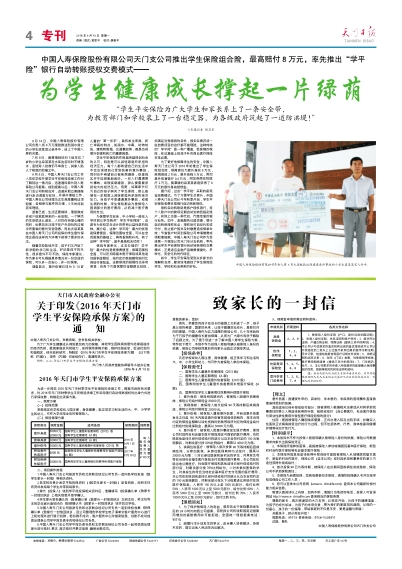 关于印发《2016年天门市学生平安保险承保方案》的通知