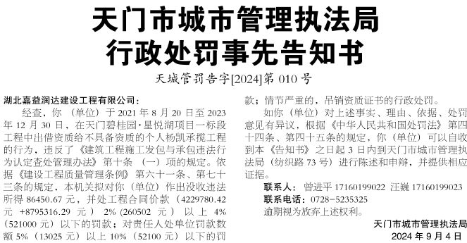 天门市城市管理执法局行政处罚事先告知书