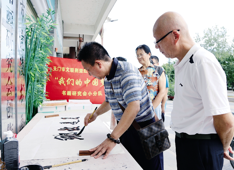 9月14日,在位于城区西湖唐街的市书画研究会创作基地,市文联、市书画研究会组织“红色文艺轻骑兵”书画研究会小分队志愿者举办“墨香庆中秋书写家团圆”活动,与市民交流书画艺术,弘扬中华优秀传统文化,促进书法艺术的交流与传承。(融媒体记者谢红艳摄)