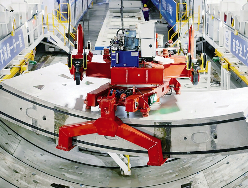 10月20日,在上海沪渝蓉高铁崇太长江隧道施工现场,“领航号”盾构机进行管片吊装作业。