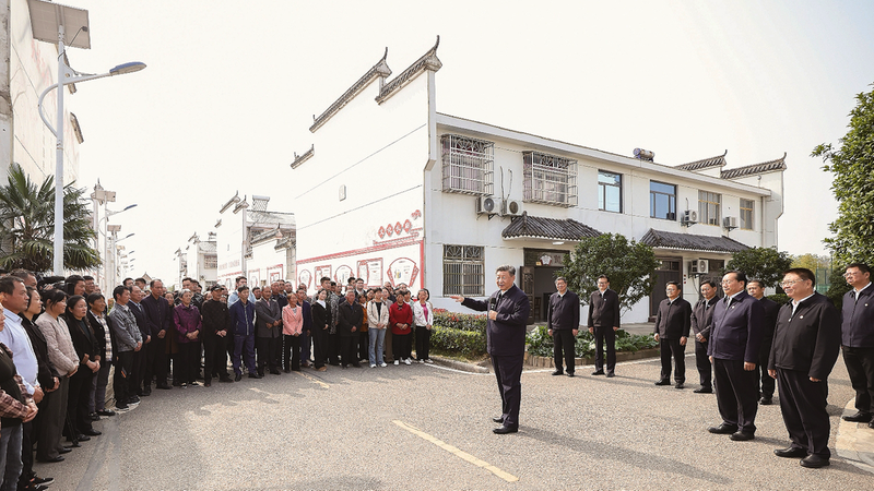 11月4日至6日,中共中央总书记、国家主席、中央军委主席习近平在湖北考察。这是5日上午,习近平在咸宁市嘉鱼县潘家湾镇四邑村考察时,同村民们亲切交流。新华社发