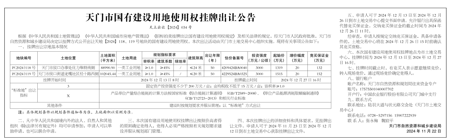 天门市国有建设用地使用权挂牌出让公告