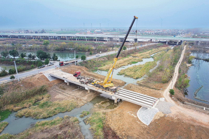 12 月10日,随着干中桥的最后一片梁精准就位,平稳横跨两岸,华严湖综合治理项目西湖环湖路网顺利闭合。华严湖地处我市东南部,总流域面积209平方公里,横跨干驿、马湾、卢市、净潭等乡镇,是养育一方百姓的“母亲湖”。华严湖综合治理工程作为全市重点水利工程,于去年7月正式开工建设,目前正有序推进。新建于干中渠上的干中桥,是连接华严湖西湖环湖道路与交通主干道的重要纽带,也是缩减四个乡镇到华严湖区距离的便民要道。本次桥梁形式为预应力简支T形梁,桥梁全长64米,桥面全宽8 米。(融媒体记者邓慧遐通讯员许磊卞挺摄)