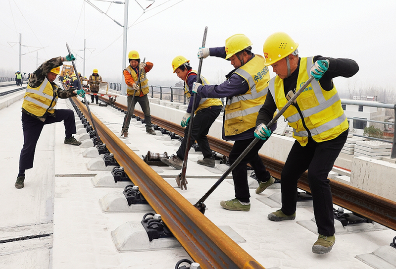 12月25日,在沪渝蓉高铁天门市石家河镇段面,轨道铺设作业以每天6公里的速度向前推进。(融媒体记者张俊摄)