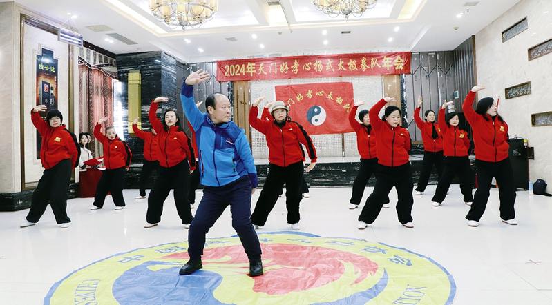 12月28日,天门好孝心杨式太极队举行迎新年联欢活动,50多名队员欢聚一堂,表演了太极功夫扇、表演唱、小品等近20个节目。(融媒体记者杨蜜摄)