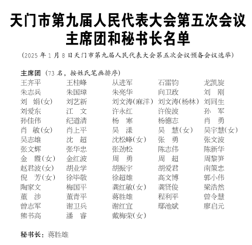 天门市第九届人民代表大会第五次会议主席团和秘书长名单