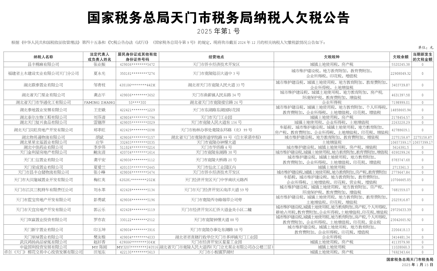 国家税务总局天门市税务局纳税人欠税公告