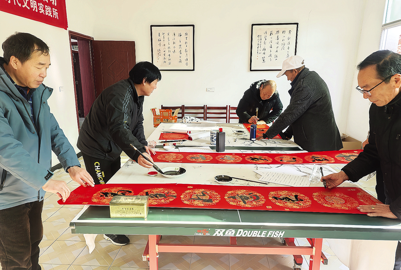 近日,蒋场镇组织书法爱好者在镇新时代文明实践所开展庆春节写对联活动,志愿者们将写好的春联送到群众手中,送上新春祝福。
