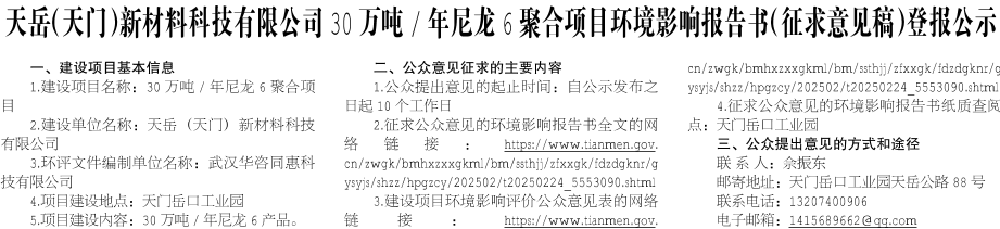 天岳(天门)新材料科技有限公司30万吨/年尼龙6聚合项目环境影响报告书(征求意见稿)登报公示