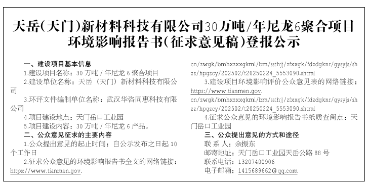 环境影响报告书(征求意见稿)登报公示天岳(天门)新材料科技有限公司30万吨/年尼龙6聚合项目
