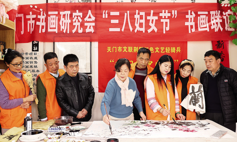 3月7日,市文联荆楚红色文艺轻骑兵书画研究会小分队志愿者在市竟陵书画社、书画研究会创作基地开展“三八”妇女节书画联谊活动,在墨香中交流书画艺术,一展芳华。