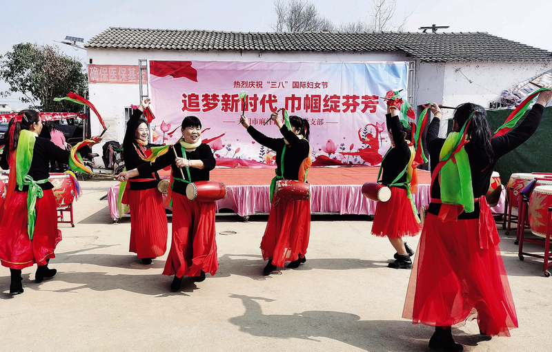 3月7日,麻洋镇方湾村党群服务中心广场上,村民身着盛装、载歌载舞。当日,该村举办“追梦新时代巾帼绽芬芳”庆祝“三八”妇女节活动,邀请在村妇女儿童共进午餐,表演了舞蹈、腰鼓、歌曲演唱等节目。(融媒体记者杨蜜摄)