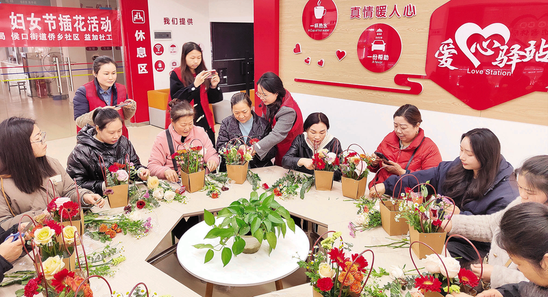 3月7日,侯口街道侨乡社区联合益加社会工作服务中心,在社区党群活动中心举办“花香满侨乡巾帼绽芳华”主题插花活动。20余位女性居民精心制作出独具匠心的花艺作品,展现了新时代女性自信优雅的精神风貌。(融媒体记者鄢紫通讯员李忱摄)