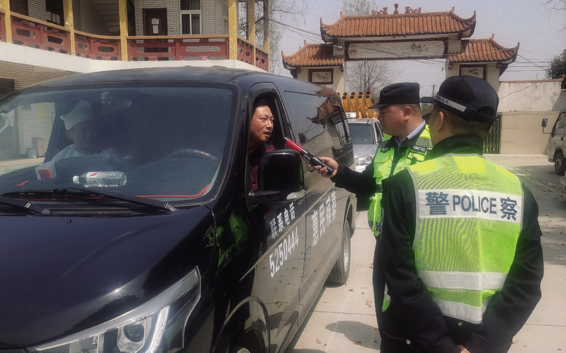 4月1日,在市中心殡仪馆,交警用呼气式酒精测试仪对殡仪车司机进行检测。当日,市殡葬管理所联合市公安局交警支队对市中心、拖市、麻洋殡仪馆的殡仪车司机开展酒驾、醉驾、“毒驾”专项整治,强化殡葬服务车辆安全管理。