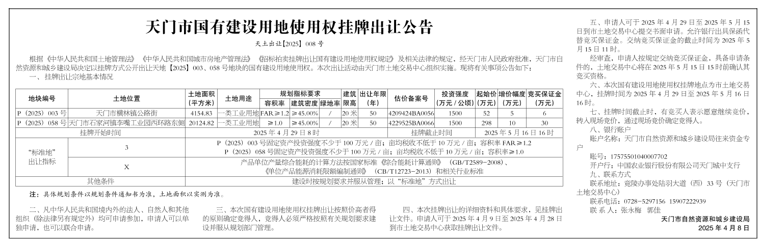 天门市国有建设用地使用权挂牌出让公告