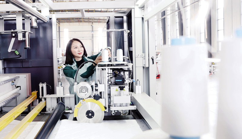 近日,湖北乔木森家具有限公司技术人员在床垫压花生产线上检测。为满足市场需求,公司压缩卷包床垫生产车间配置了床垫自动压缩卷包生产线等,年产能达10万张,满产后预计年销售收入将超1亿元。(特约记者肖敦秋融媒体记者刘银斌摄)