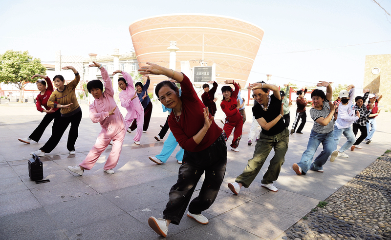 4月24日,在石家河镇马溪社区,石家河太极队队员正在练习石家河凤舞。石家河太极队于两年前组建,现已发展至数十人,通过指导群众练习太极拳、剑及石家河凤舞,不仅丰富群众的精神文化生活,也形成全民健身的良好氛围。(融媒体记者谢红艳摄)