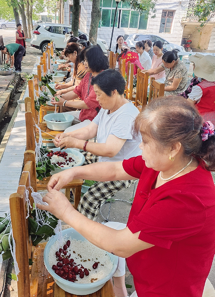 5月29日,蒋场镇组织村(社区)妇女主任、村民代表、志愿者40余人开展“粽庆端午情暖蒋场”端午主题活动。活动现场,不会包粽子的年轻干部、志愿者跟着技艺娴熟的“老师傅”们学习如何包粽子,传承传统技艺,共同营造欢乐、祥和的节日氛围。