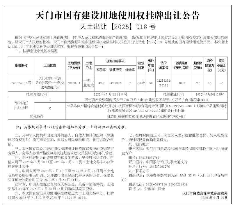 天门市国有建设用地使用权挂牌出让公告