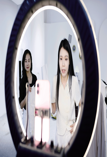 6月18日,在中国(天门)服装电商城,湖北莱依窕服饰主播正在直播带货。据悉,服装电商城与希音、拼多多TEMU等跨境电商平台深度合作,将天门生产的服装卖到欧美和东南亚等国家。