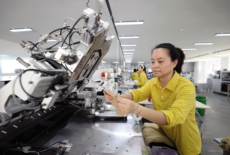 7月3日,湖北永佳服饰有限公司员工在口袋贴袋生产线上作业。公司专注女装设计,推出自有品牌“伊栢莲”。目前,公司凭借AI技术打造智能化产业链,产品远销欧美、东南亚等地。(融媒体记者刘银斌摄)