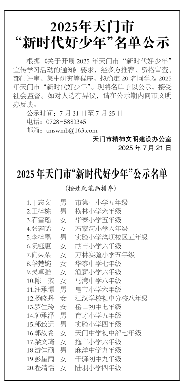 2025年天门市“新时代好少年”名单公示